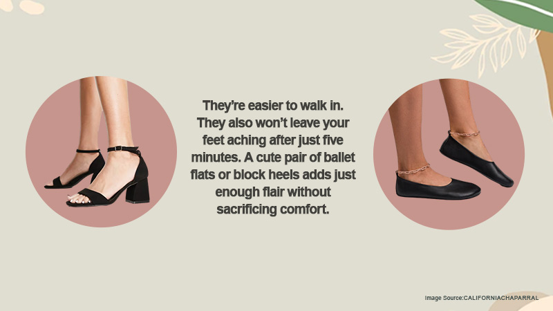 They’re easier to walk in. They also won’t leave your feet aching after just five minutes. A cute pair of ballet flats or block heels adds just the right amount of flair without sacrificing comfort.