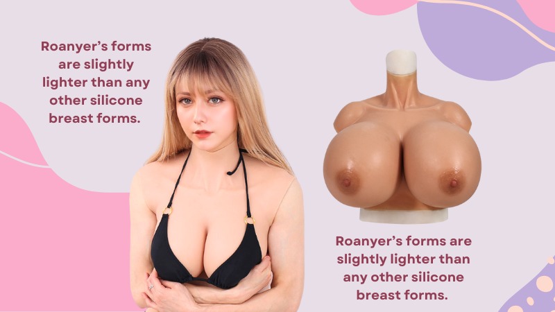 Silicone breast forms vary in weight depending on the manufacturer. Roanyer’s forms are slightly lighter than any other silicone breast forms. As such, they minimize shoulder tension while stimulating an imaginable jiggle and bounce.