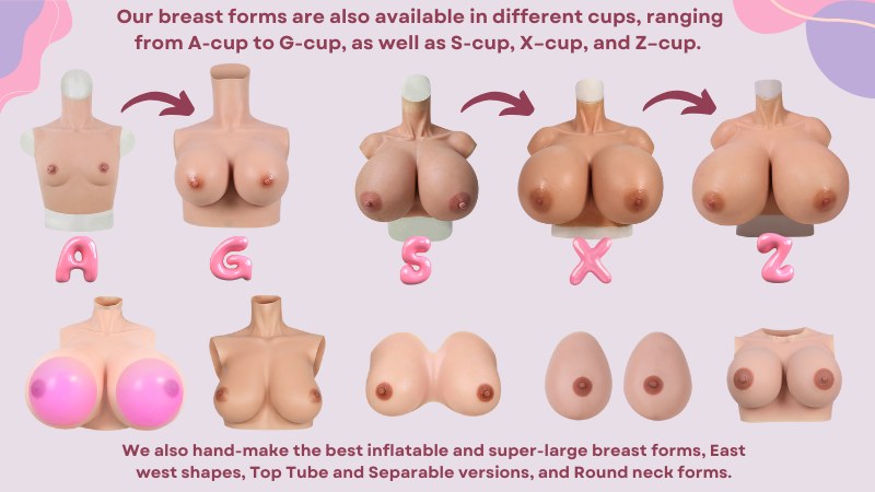Our breast forms are also available in different cups, ranging from A-cup to G-cup, as well as S-cup, X–cup, and Z–cup. They mimic the natural breast size, shape, and texture to provide the most realistic look and feel.