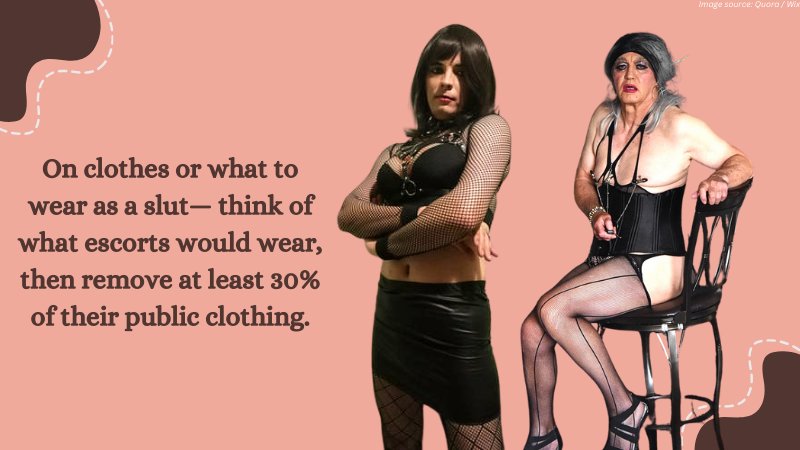 On clothes or what to wear as a slut— think of what escorts would wear, then remove at least 30% of their public clothing. Remember, sluts don’t have any sense of what chastity is, so the more vulgar your outfit, the better.