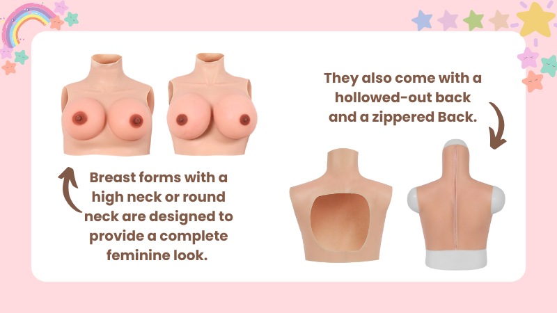 Breast forms with a high neck or round neck are designed to provide a complete feminine look. This high neck type is best for you if you have an Adam’s apple on your neck.