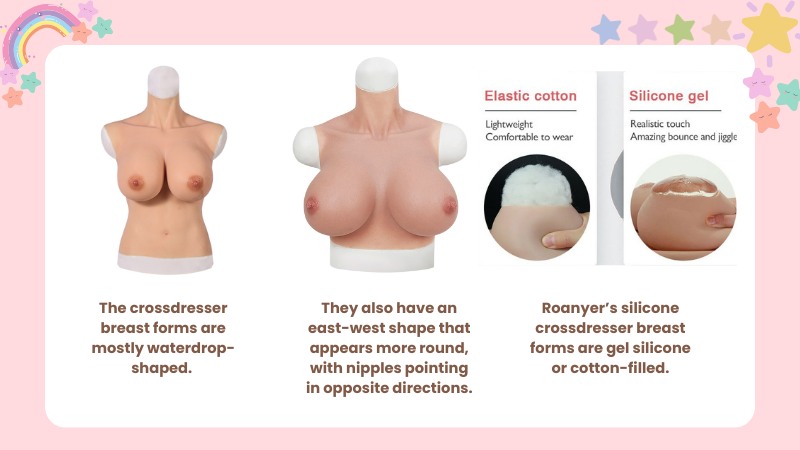 The crossdresser breast forms are mostly teardrop-shaped. They also have an east-west shape that appears more round, with nipples pointing in opposite directions.
