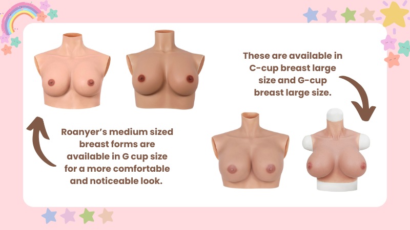 Roanyer’s medium seized breast forms are available in G cup size for a more comfortable and noticeable look. They give a bubbly, fuller, and natural feminine appearance.
