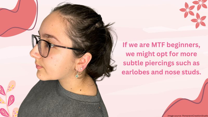 If we are MTF beginners, we might opt for more subtle piercings such as earlobes and nose studs.