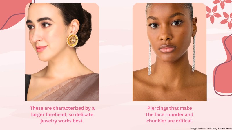 These work best with round jewelry, as these soften the face edge. As a result, piercings, studs, and hoop designs work best to balance the face.