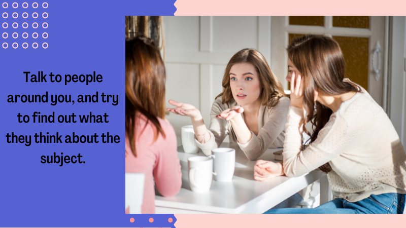 Talk to people around you, and try to find out what they think about the subject.