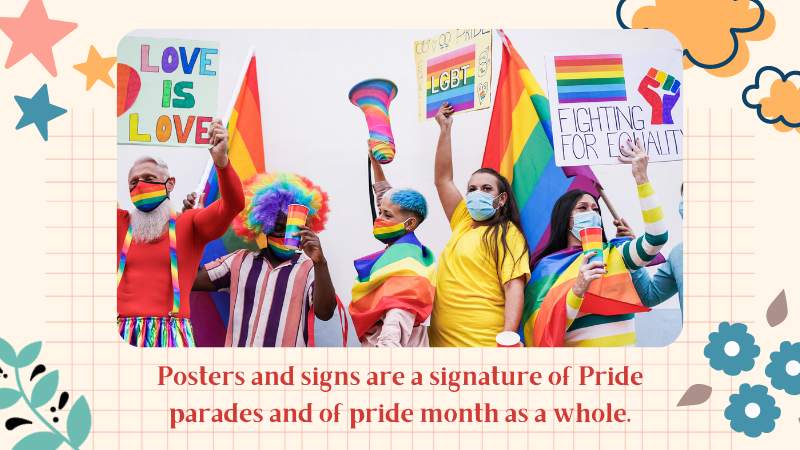 Posters and signs are a signature of Pride parades and of pride month as a whole. They help elevate morale and encourage other community members to join the mass. They usually have words of order, the community’s demands, or motivational phrases. And the best part about them is that anyone can make one with a piece of cardboard and some paint. SO if you’re going to a parade, this is an experience you shouldn’t miss.