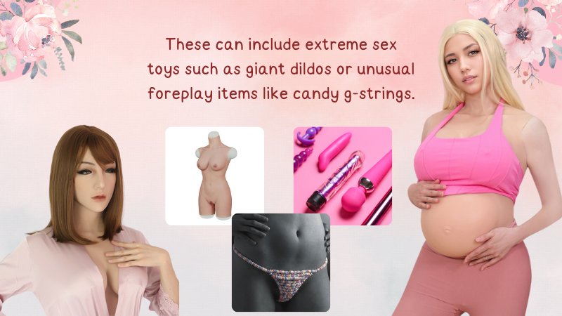 These can include extreme sex toys such as giant dildos or unusual foreplay items like candy g-strings.