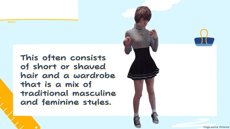 This often consists of short or shaved hair and a wardrobe that is a mix of traditional masculine and feminine styles.