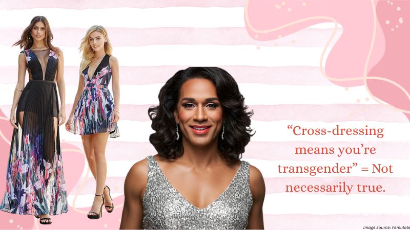 - “Cross-dressing means you’re transgender” = Not necessarily true. Some cross-dressers are transgender, but many are not. The way that you wish to express yourself and the way you feel about your gender are two separate things.