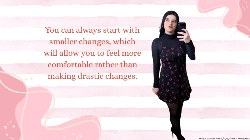 One way to start overcoming this is by easing into it. You don’t have to go full glam on your first try. You can always start with smaller changes, which will allow you to feel more comfortable rather than making drastic changes. A simple change of colour clothing palette could work.