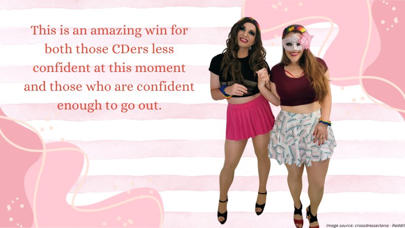 That’s not to say discrimination doesn’t exist; it does. But attitudes are changing fast. More and more people are embracing gender fluidity, and conversations around gender expression are becoming normalised. This is an amazing win for both those CDers less confident at this moment and those who are confident enough to go out.
