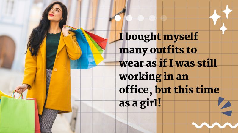 Of course, I was taking full advantage of this opportunity and bought myself many outfits to wear as if I were still working in an office, but this time as a girl!