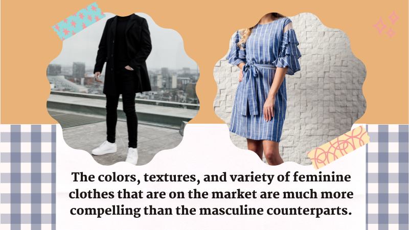 The colors, textures, and variety of feminine clothes that are on the market are, most of the time, much more compelling than their masculine counterparts.