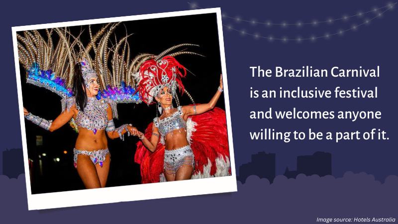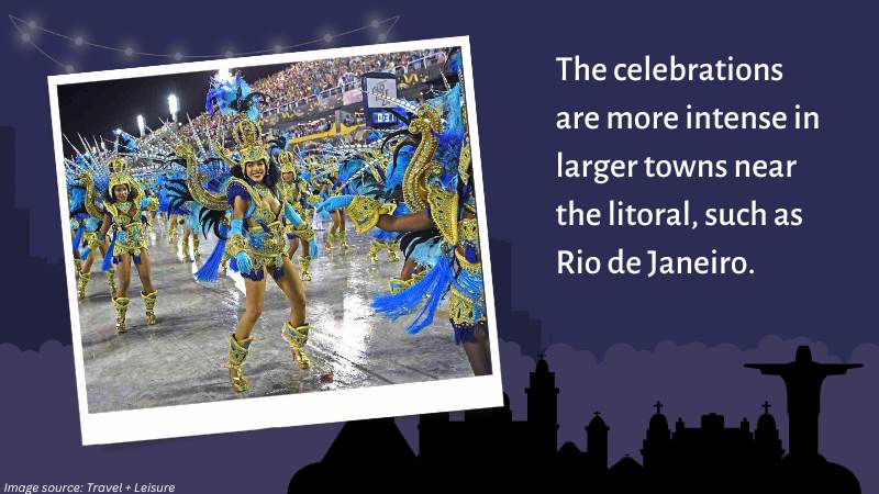 Well, it depends on the region. But in most cities, it’s a 6-day-long holiday in which people party, sing, and dance on the streets. The celebrations are more intense in larger towns near the litoral, such as Rio de Janeiro. We get millions of people celebrating at the same time. That is, Including hundreds of thousands of tourists and foreign visitors. Popular styles of music include the local Samba. But you can expect different tunes based on your location and who’s with you. But you can expect a cheerful crowd and lots of cross-dressers. I’ll tell you more about that in this article’s next section.