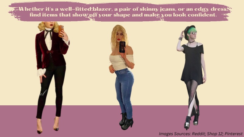 Instead, focus on finding pieces that fit close to your body and bring out the best in you. Whether it’s a well-fitted blazer, a pair of skinny jeans, or an edgy dress, find items that show off your shape and make you look confident.