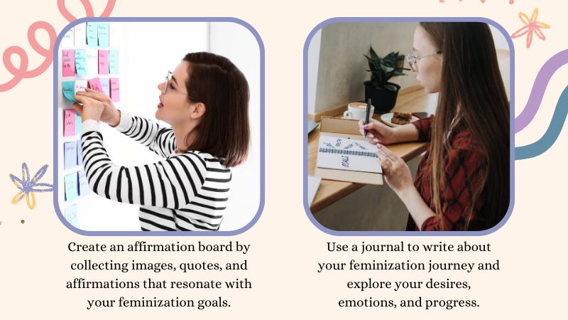 Create an affirmation board by collecting images, quotes, and affirmations that resonate with your feminization goals.