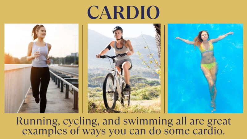 Running, cycling, and swimming all are great examples of ways you can do some cardio. If you feel any pain or whatsoever in your knees while running, you should stop at once and replace it with another exercise like cycling to avoid impactful movements. From thirty to forty minutes of cardio, every day is a great starting point.