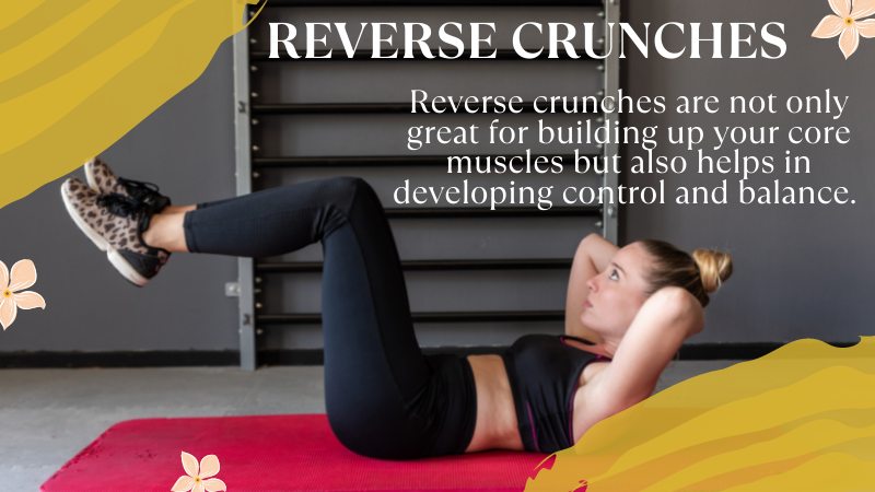 This exercise is not only great for building up your core muscles but also helps in developing control and balance. To perform a reverse crunch lay on the ground with your back straight and place your hands behind your head.