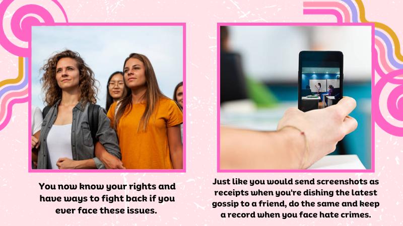 Just like you would send screenshots as receipts when you’re dishing the latest gossip to a friend, do the same and keep a record when you face hate crimes.